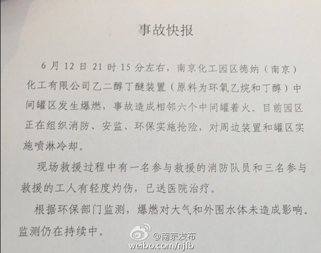 图据微博 央视新闻【南京一化工厂爆炸】据南京消防消息,今日21时15分,南京化工园区德纳化工厂发生火灾。截至目前,现场已连续多次爆炸,周边居民房子均有震感。南京消防指挥中心已调集7个消防中队30车151人、扬子消防队4个中队赶赴现场。爆炸后人员已全部撤离至安全区,装置周边自动水炮已开启。(央视记者李筱) 最新:目前明火燃烧高度约15米,经确认现场为环氧乙烷装置发生爆炸起火,并引燃周边三个醇类储罐(共6个,目前3个未起火),每个罐体容量约1000立方米,目前火势呈稳定燃烧状态,移动炮等固定消防设施正在出水降温,阻止蔓延。
